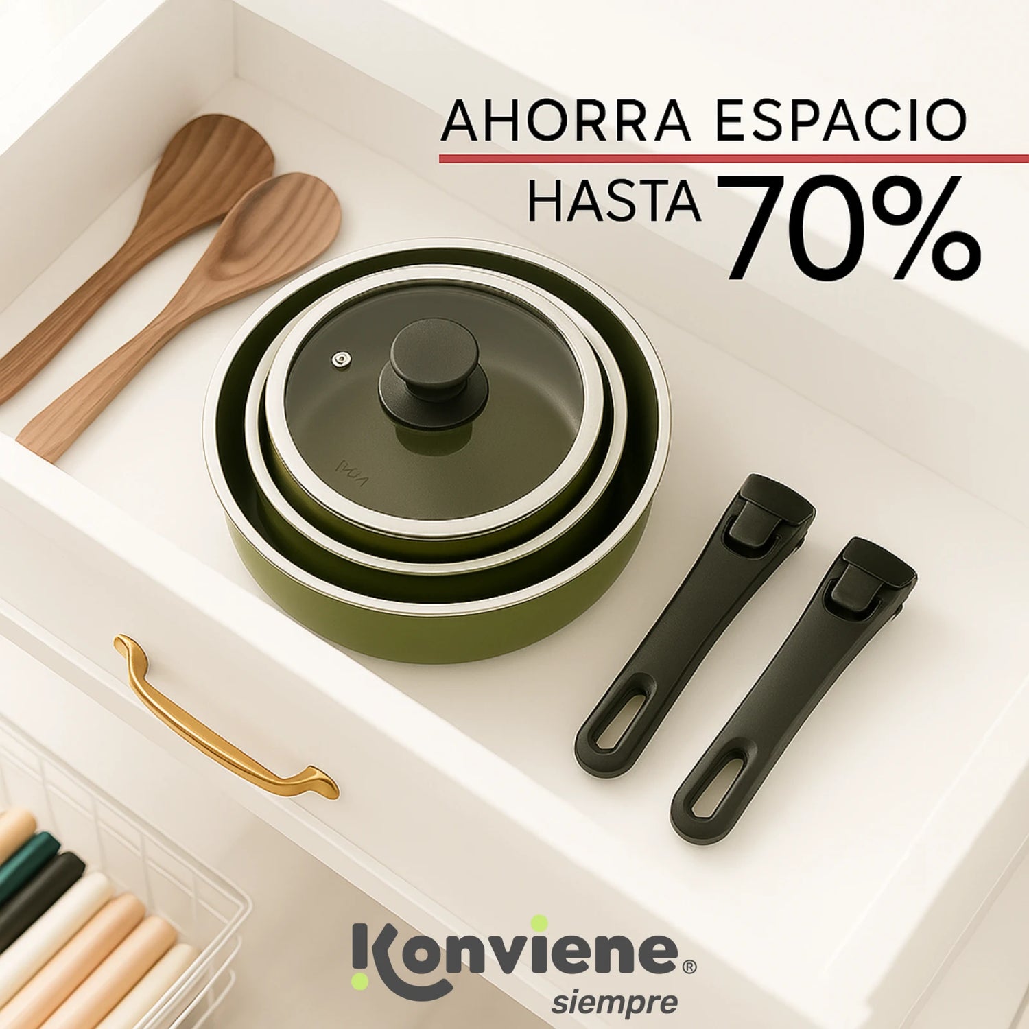Este set antiadherente está diseñado para adaptarse a cualquier cocina, incluso las más pequeñas. Apilable, funcional y duradero: ideal para quienes cocinan con amor y buscan cuidar de su salud.
