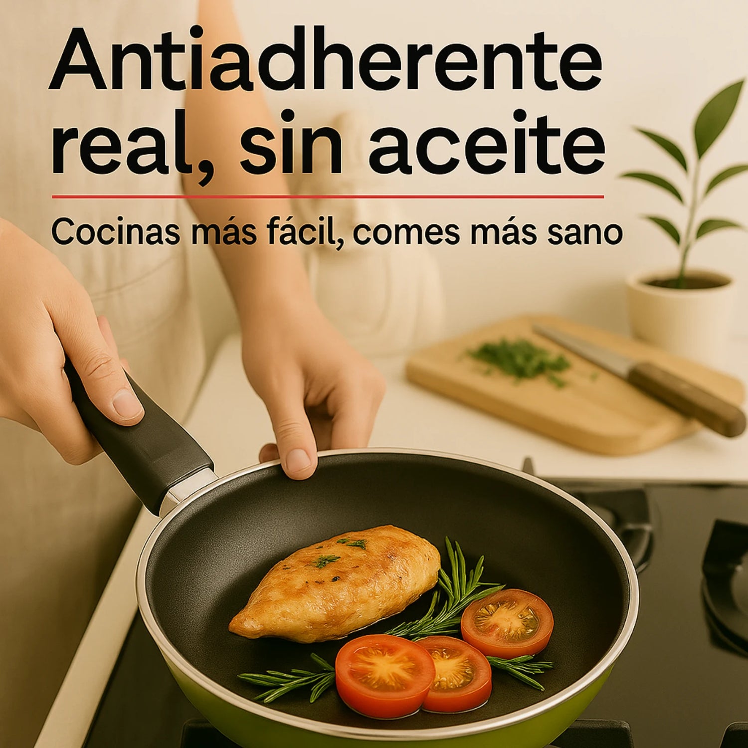 Fabricada en Italia con recubrimiento antiadherente de alto rendimiento, esta batería permite cocinar con menos aceite, limpiar con facilidad y guardar sin ocupar espacio. Compatible con estufas de gas y eléctricas.