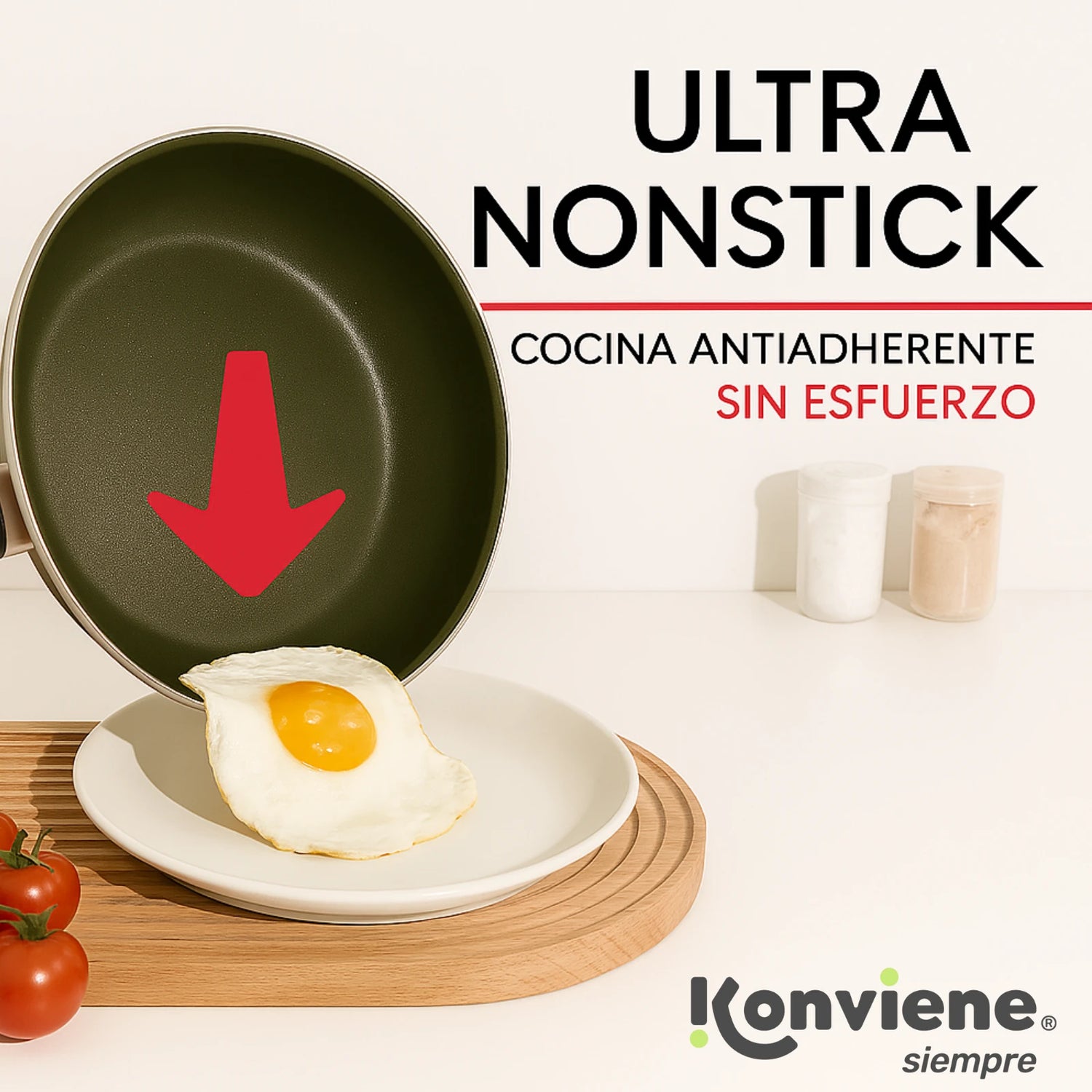 Todos nuestros utensilios están fabricados con aluminio prensado de alta calidad y recubrimiento antiadherente libre de PFOA, para que cocines con menos aceite, más saludable y con más tranquilidad.